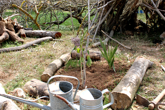El espacio del bosque es también un tiempo donde aprender a compartir. Desde principios de curso, las niñas y los niños empezaron a construir cabañas en el bosque y, con la primavera, han empezado a hacer pequeños huertos de manera espontánea sembrando semillas que llevaban de casa: ajo, semillas de manzana, cebollas, …. Aprovechando estas ganas de cultivar, durante el Proyecto Bosque se ha ideado un espacio de huerto y jardín compartido donde todos puedan hacer crecer desde semillas llevadas de casa a pequeñas plantas. La idea es que pasen de este concepto más privado a lo comunitario y compartido. Así, durante la última jornada, se sembró borraja, Caléndula Oficialis y semillas de calabaza. La idea no es tener un huerto de donde sacar verduras comestibles sino un lugar donde aprender a cuidar de las plantas que servirán más tarde como materia orgánica para enriquecer la tierra, donde puedan trabajar de manera cooperativa y generar un hábito entre ellos para aprender a gestionar el uso comunitario del espacio.
